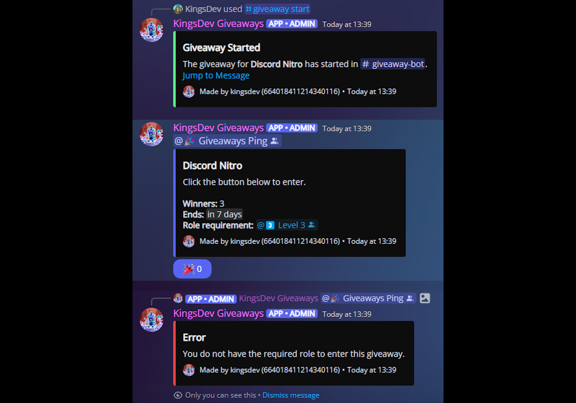 Giveaway Bot allows server staff to create and run giveaways for their community. The bot allows users to enter or leave the giveaways by clicking a button on the messages. When creating a giveaway, staff can set a prize, duration, number of winners, a message, and optionally a role requirement. The bot uses a MongoDB database to ensure all giveaways persist after restart - if a giveaway ends while the bot is down, it will be automatically ended when the bot next starts and only entries from before the giveaway ended will be counted. Server staff can setup and reroll giveaways through the /giveaway command.