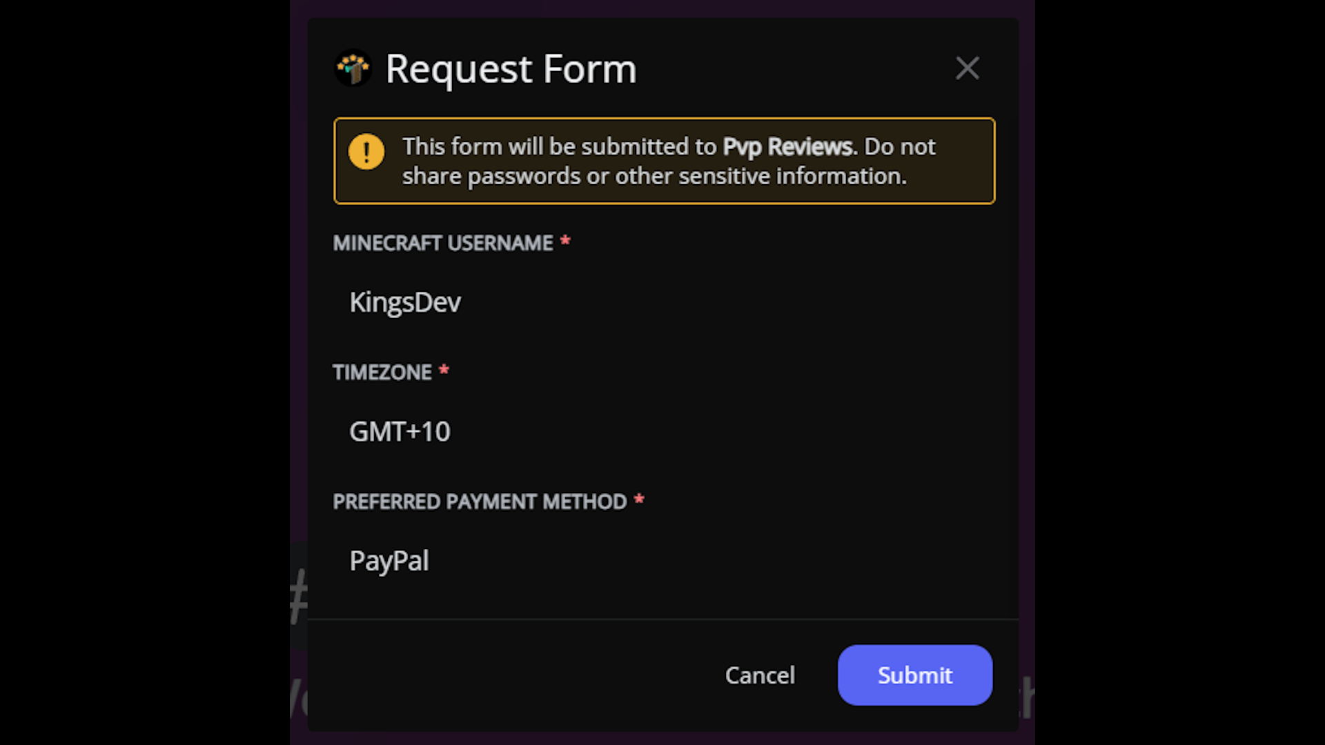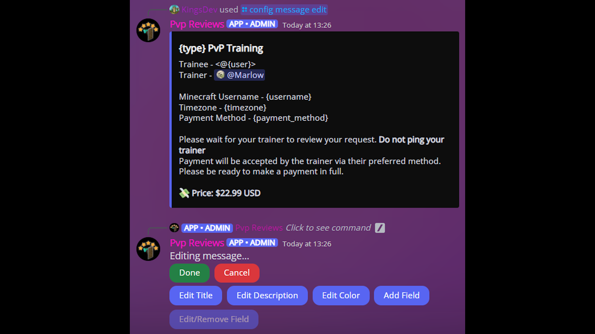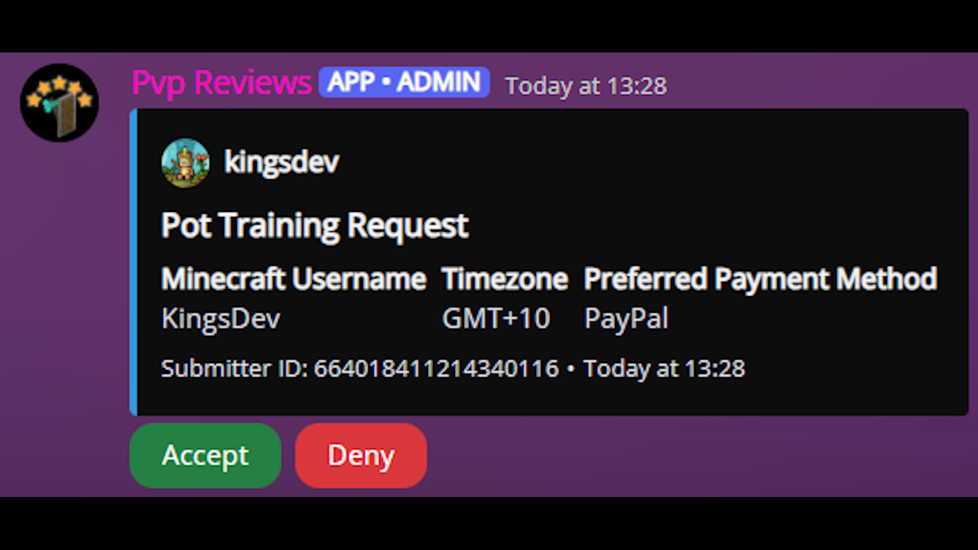 PvP Review Bot is a custom commission developed to handle paid 1.9+ PvP training and gameplay review. Users can open a ticket from a #info-and-purchase channel or similar, which contains a fully customisable embed. They can select a gamemode from a customisable list (modifiable with /config gamemodes add/remove, and they are also asked to input their Minecraft username, timezone, and preferred payment method. This sends a training request to a #review-requests channel, where the trainer (Marlow) can accept / deny the request. Each user can only have one pending training request at a time to prevent spam.