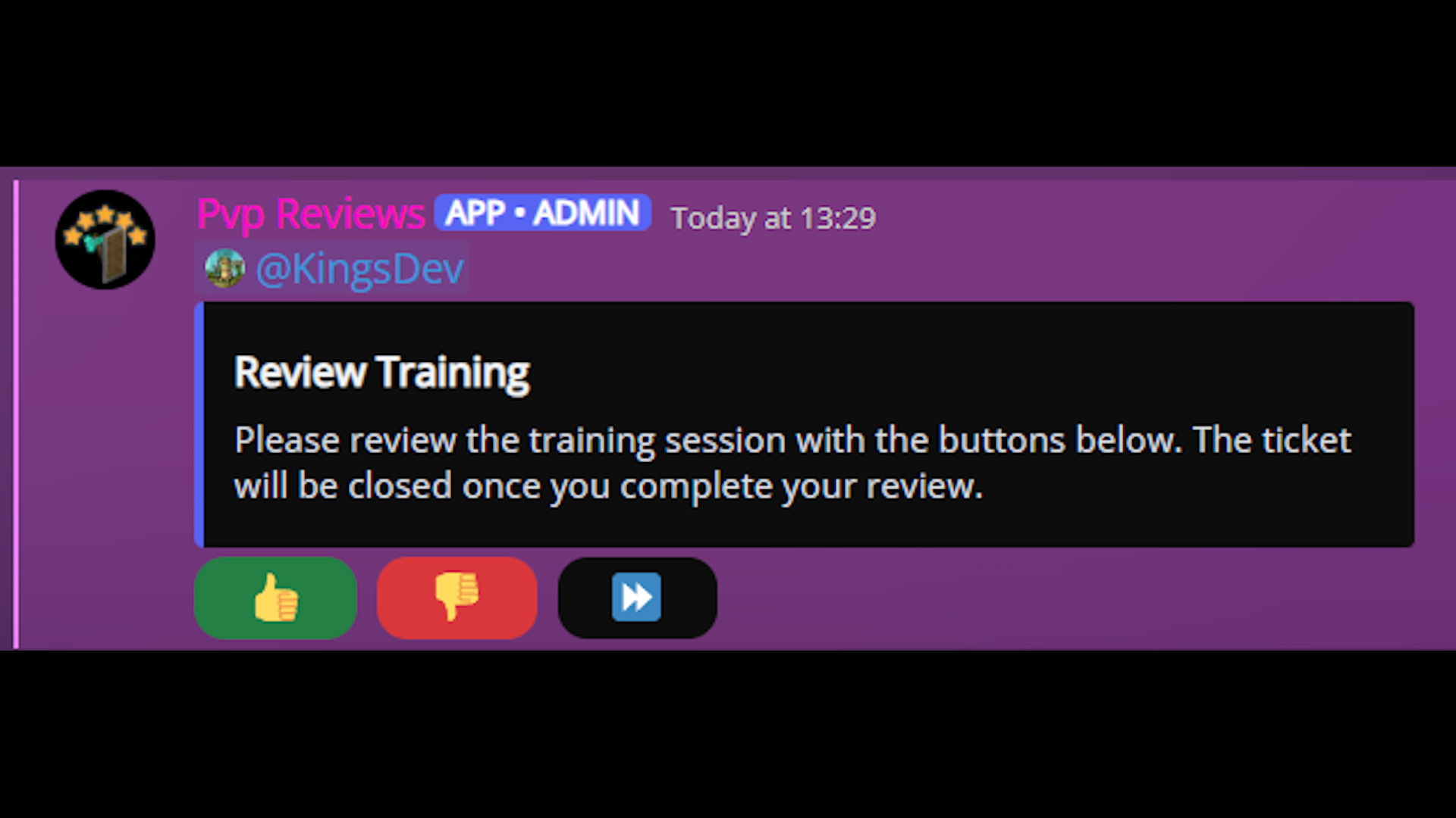 Once a training request has been accepted, a ticket is created for that user in a configurable Gameplay Review Requests category, posting the user's inputted information into a fully customisable embed. Once payment has been processed, the trainer can then press a 'Mark Paid' button, moving the ticket into a configurable Gameplay Review (Paid) category and giving the user a Customer role. When a paid ticket is closed, the bot will ask the user to leave a positive or a negative review. This review is then sent to a #reviews channel and the positive review counter in the profile embed is updated.
