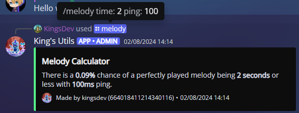 In Hypixel Skyblock, melody puzzles take a varying amount of time based on RNG and ping. Upon request, I developed a bot to allow users to easily calculate how likely (or unlikely) it is for a melody to take a certain amount of time.