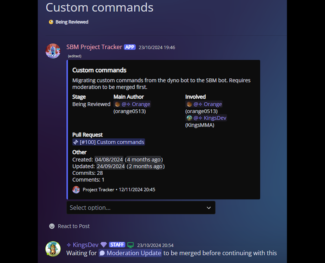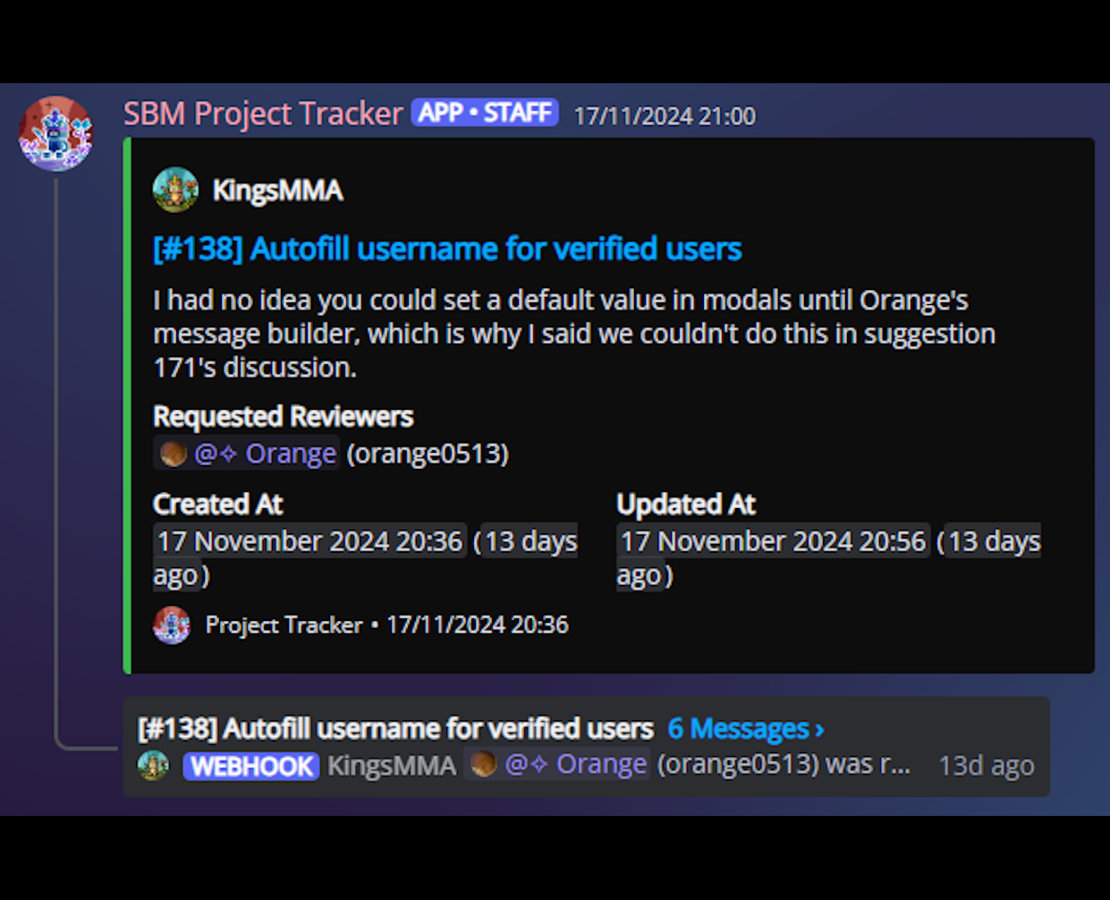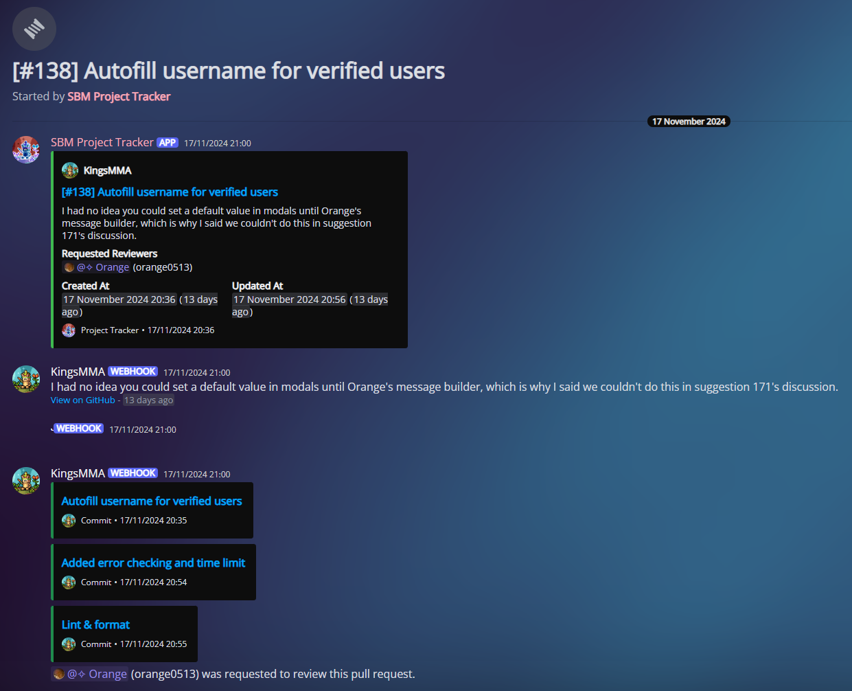 Project Tracker is a supplementary discord bot I developed to help track the development of features for the SBM bot. It: