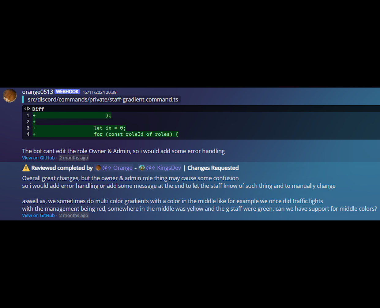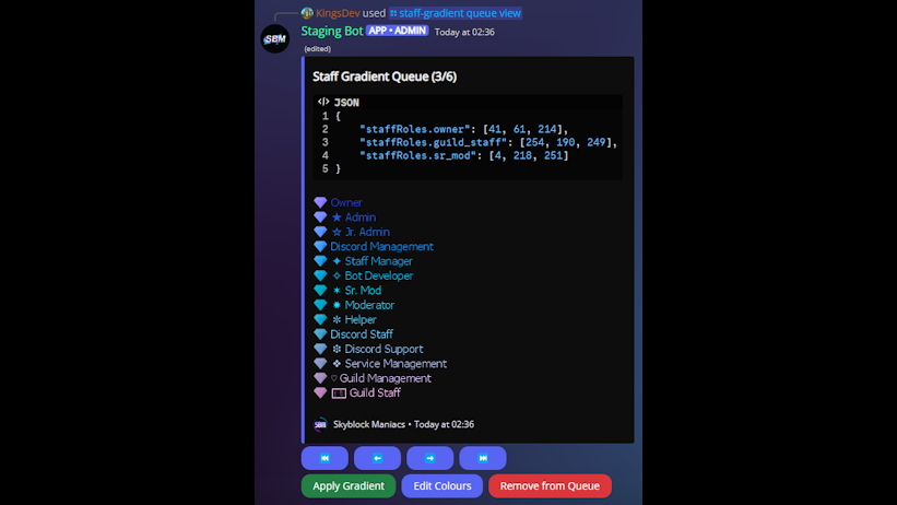 • Staff Role Gradients - At the end of every month, the role colours and icons of the staff roles are updated to a new gradient. I created a tool to automate this process by allowing custom gradients to be created and applied, and by automatically generating and applying the new role icons.