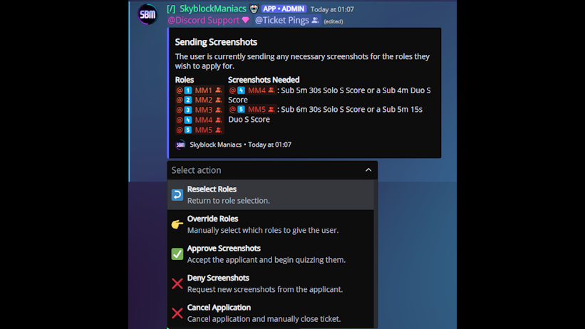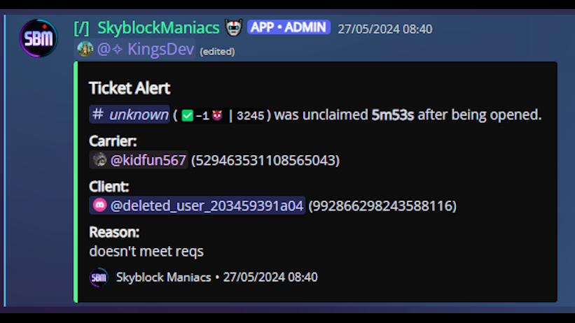 At SBM, we process over 7,500 tickets/month and 700,000+ messages/month from a userbase of 112,000 users🛈. I actively contribute to and review pull requests for the Discord bot that manages these tickets, handles carrier applications, and oversees the server. For more information regarding my contributions, go to the Projects tab.