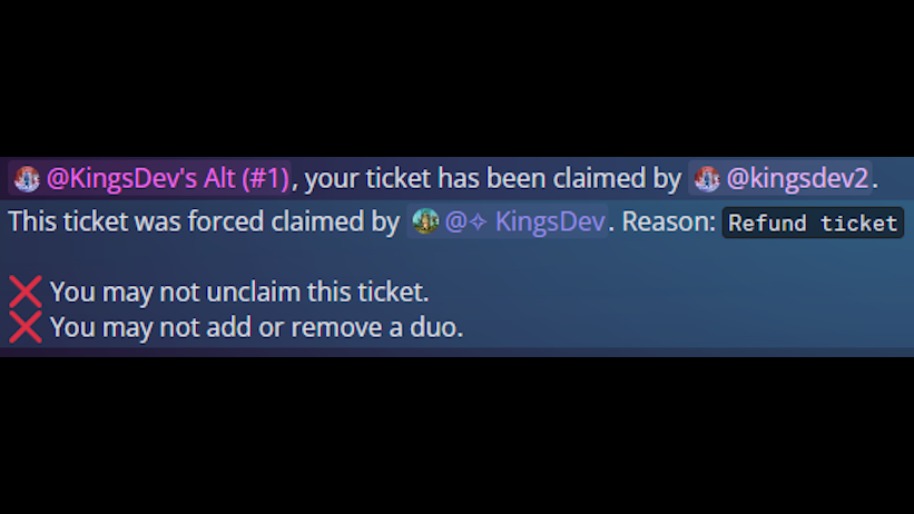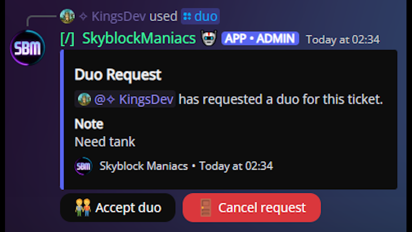 • Duo Carries - Many carriers pair up to work as a duo to carry a user. I upgraded the bot to fully support both carriers claiming the ticket and gaining score, as well as a system to request another carrier to duo with you.