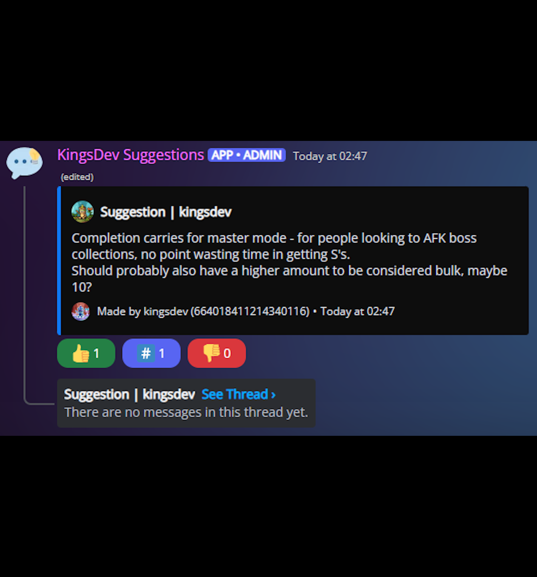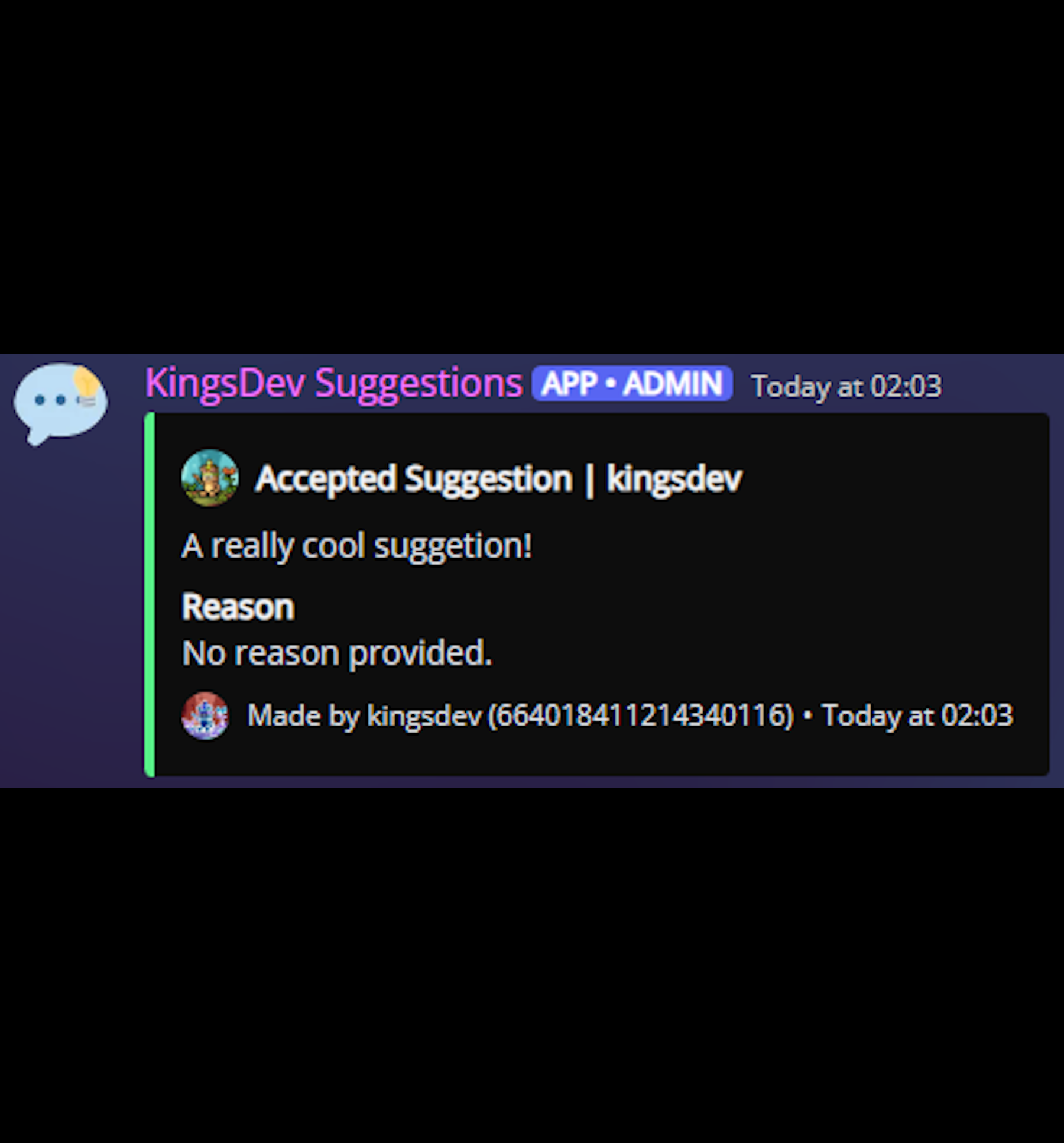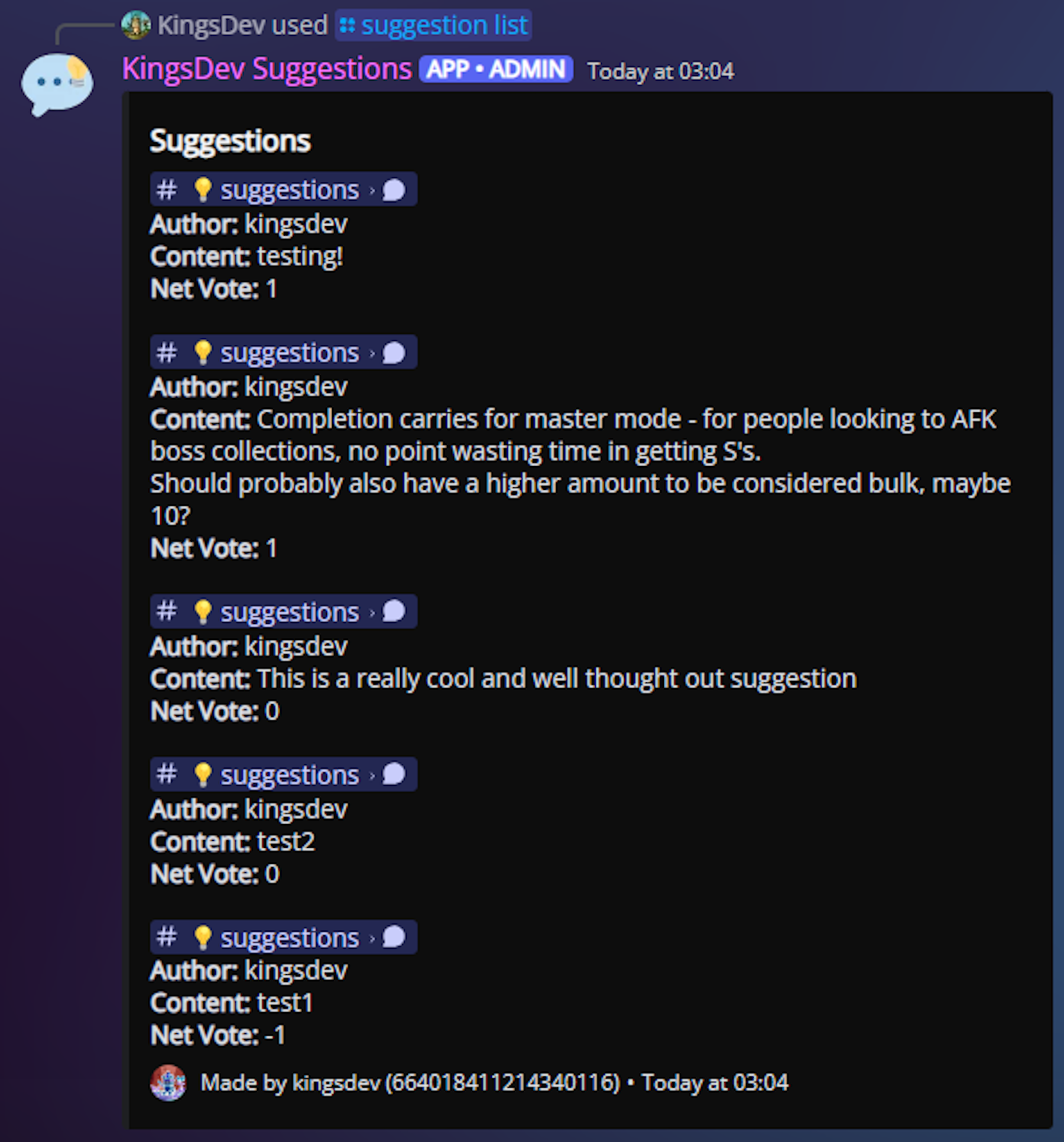 Suggestion Bot allows users to submit suggestions easily by typing in a text channel. The bot then converts these into a neatly formatted embed with buttons to allow other community members to vote and a thread to discuss the suggestion in. A ratelimit can be applied to the channel to prevent users spamming suggestions. Staff members can accept/deny these suggestions with an optional reason using the /suggestion command. To keep the suggestions channel clean, staff have the option of sending accepted and denied suggestions to their own channels; however, they can keep all suggestions in the on channel if they wish. This preference can be set using the /suggestion set-channel command.
