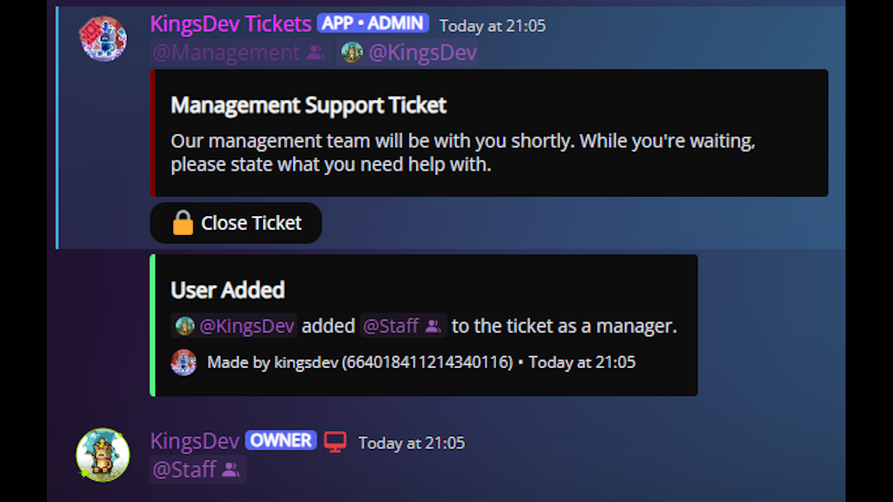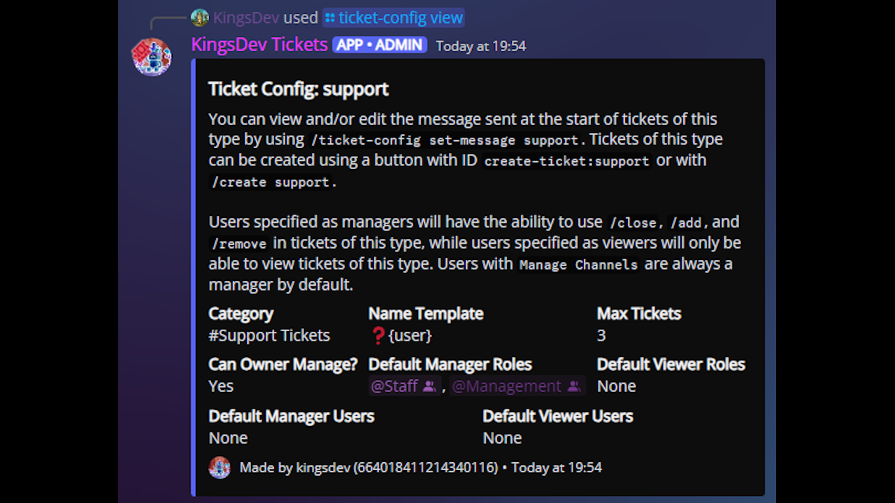 The bot allows users to create tickets using the ticket configs provided by server staff, with extensive customisability being supported. Server staff can setup which users and roles (and optionally the ticket owner) can manage the ticket; they can also configure the category, name template, maximum number of tickets per user, and default role overrides for each individual ticket config. Users and roles can be added to tickets as either a viewer or a manager. As previously stated, the ticket panels and starting messages are fully configurable from inside Discord.