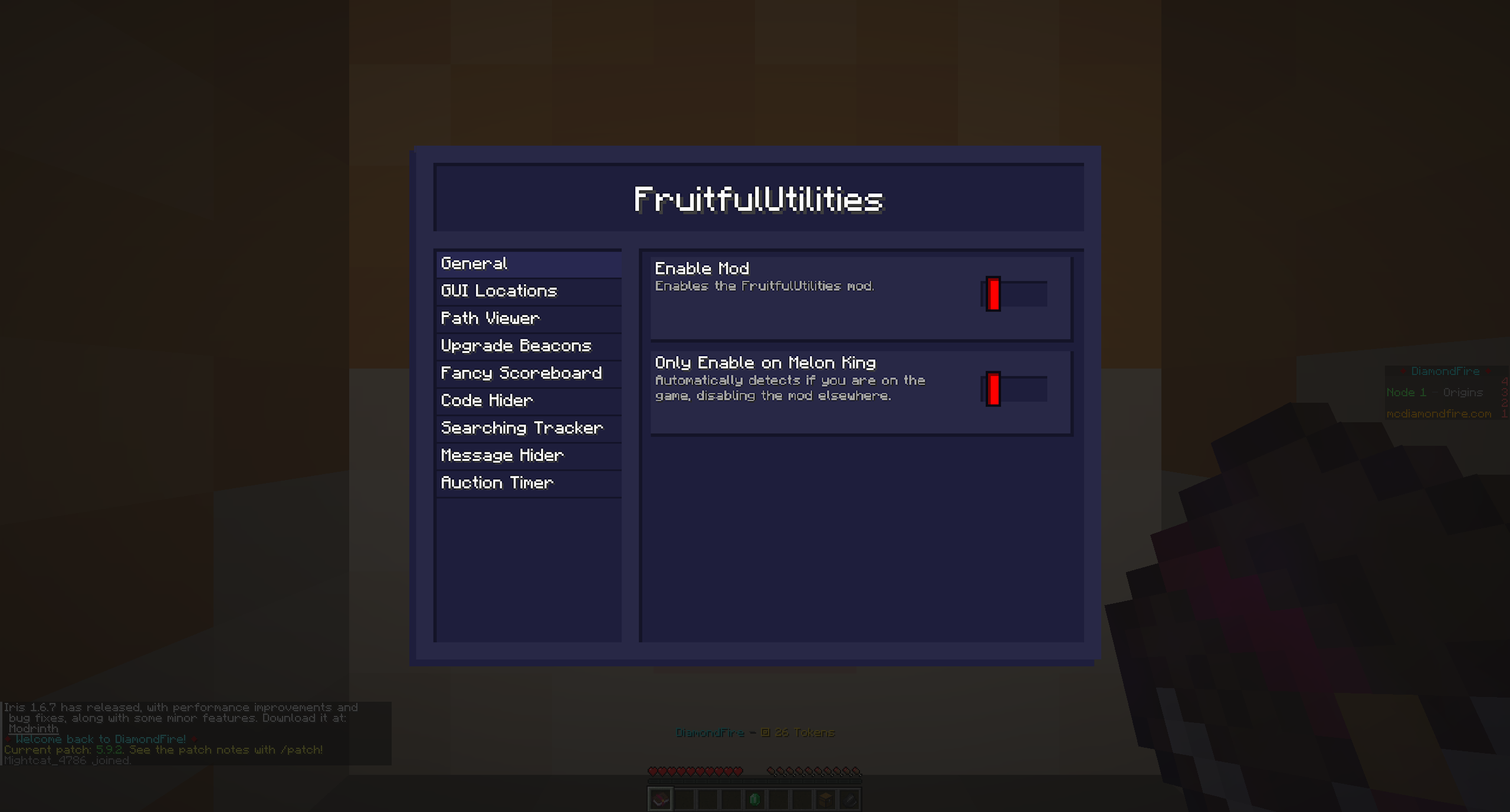FruitfulUtilities is a utility mod for Melon King on the DiamondFire minecraft server. It is a client-side fabric mod designed to enhance the user experience and to guide newer players in Melon King, similar to mods such as Skytils or NotEnoughUpdates for skyblock. Throughout development, I focused on making data-driven systems for the mod: the config screen is generated and storage is handled using annotated fields and classes; the path viewer and upgrade viewer's upgrade data is loaded from a series of JSON files on a sister repo; HUD elements are managed using a custom system involving annotated classes for serialisation and rendering.