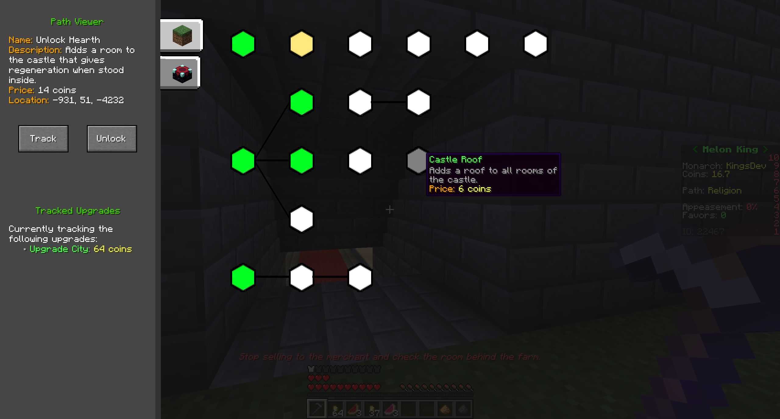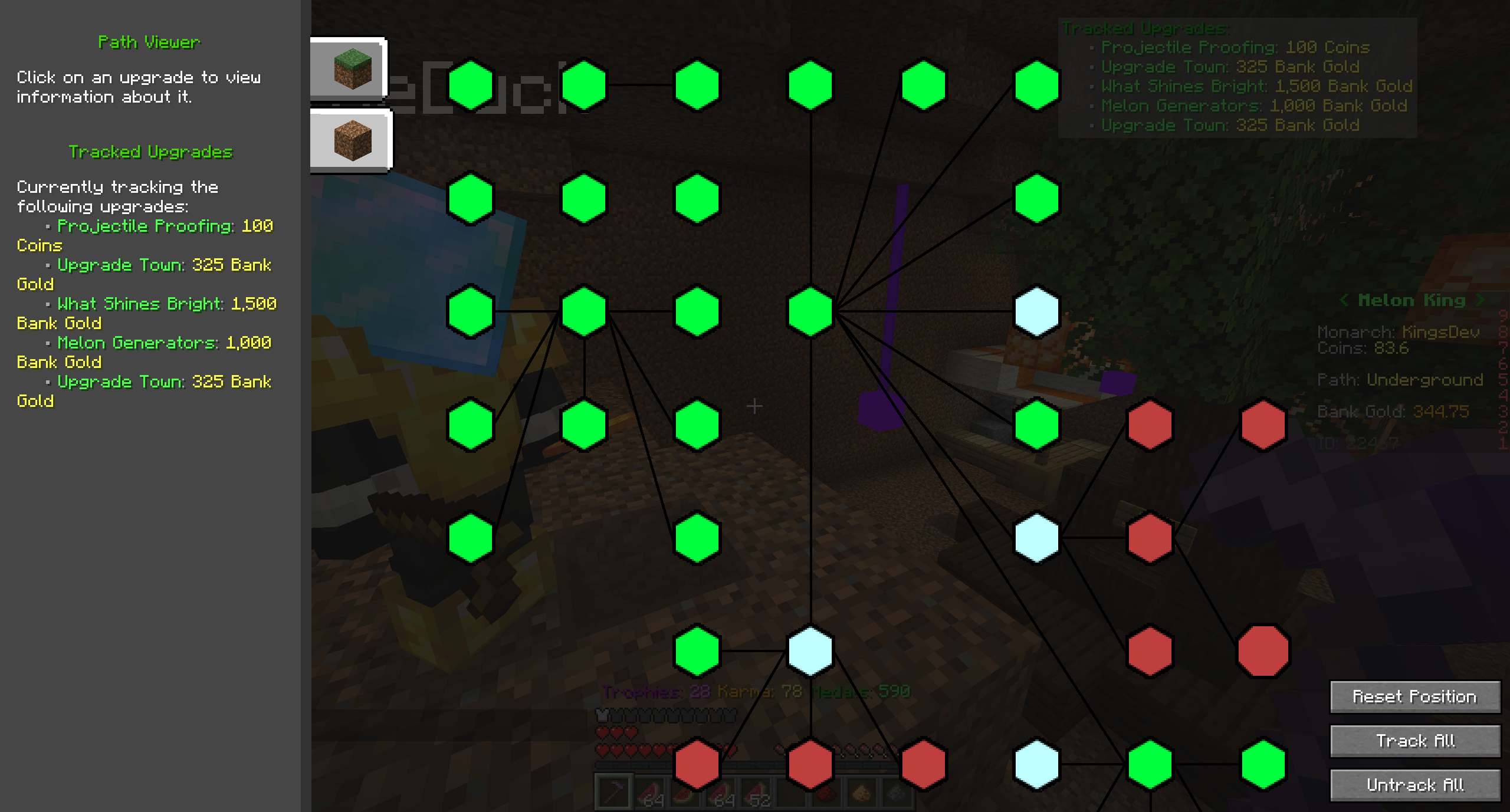 • In-depth path viewer - Melon King is a story-based game in which each run the monarch would choose among a variety of different upgrade paths to reach an ending. The data-driven path viewer helps guide newer players along these paths, advising them on which upgrades they should purchase and assisting them in locating any upgrades they may have missed.