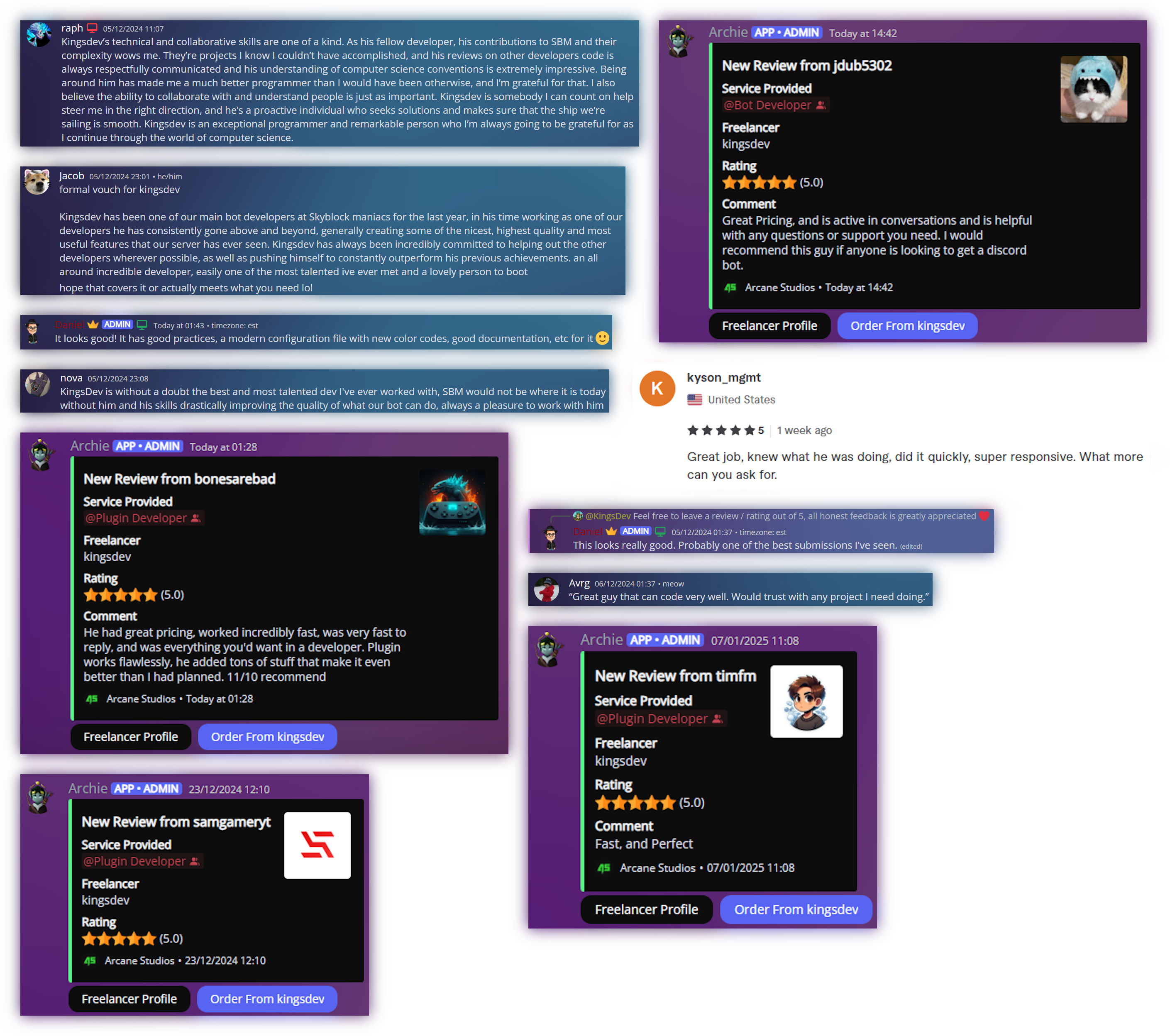 I have worked with a lot of people while developing a variety of projects and commissions. Some people have left me vouches / reviews; these can be seen below. To open the image in a new tab, click on it.